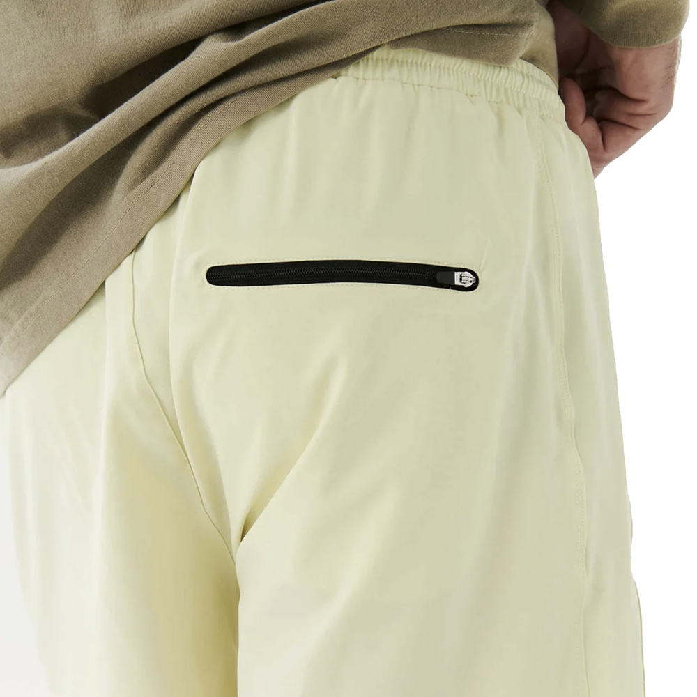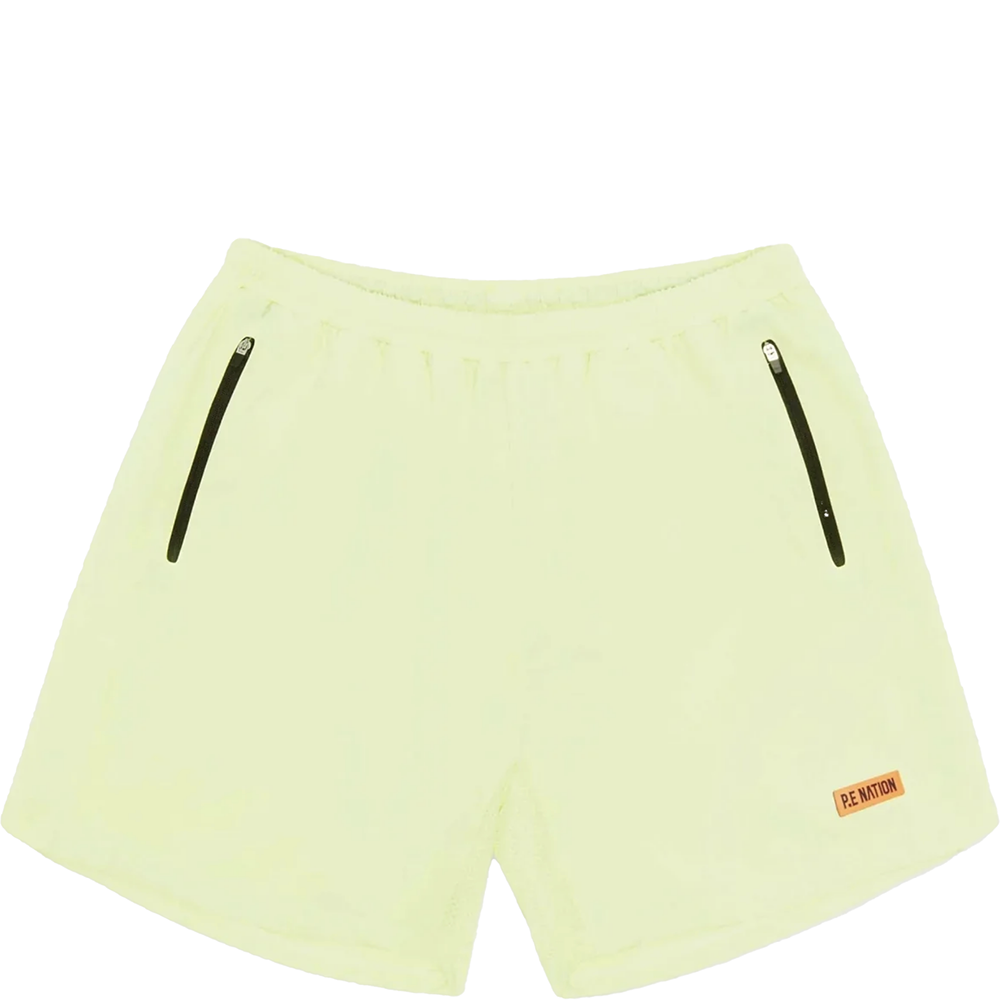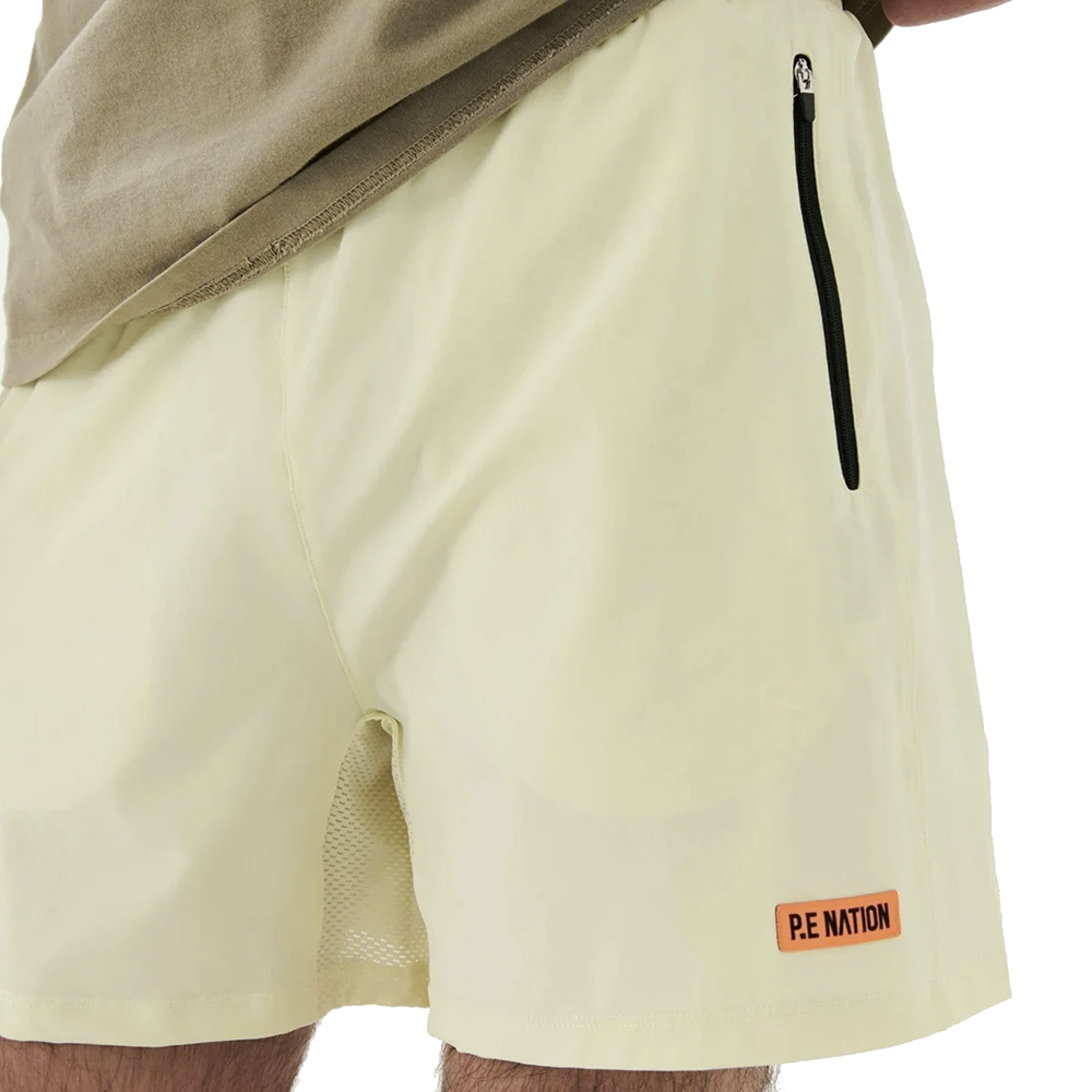 92% Recycled Polyester & 8% Elastane. High performance shorts with water repellent fabrication. Elasticated waistband with both back & side pockets with zipper. Internal drawcord with P.E Nation toggles